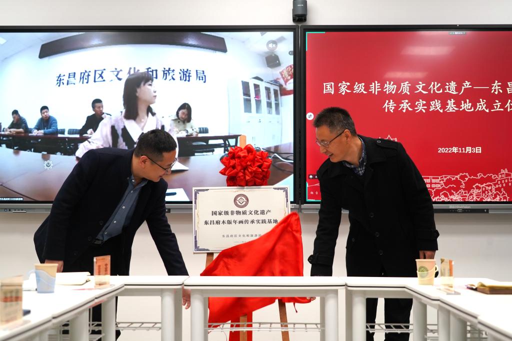 隨后,劉超和張西俊共同為國家級非物質文化遺產東昌府木版年畫傳承實踐基地揭牌。