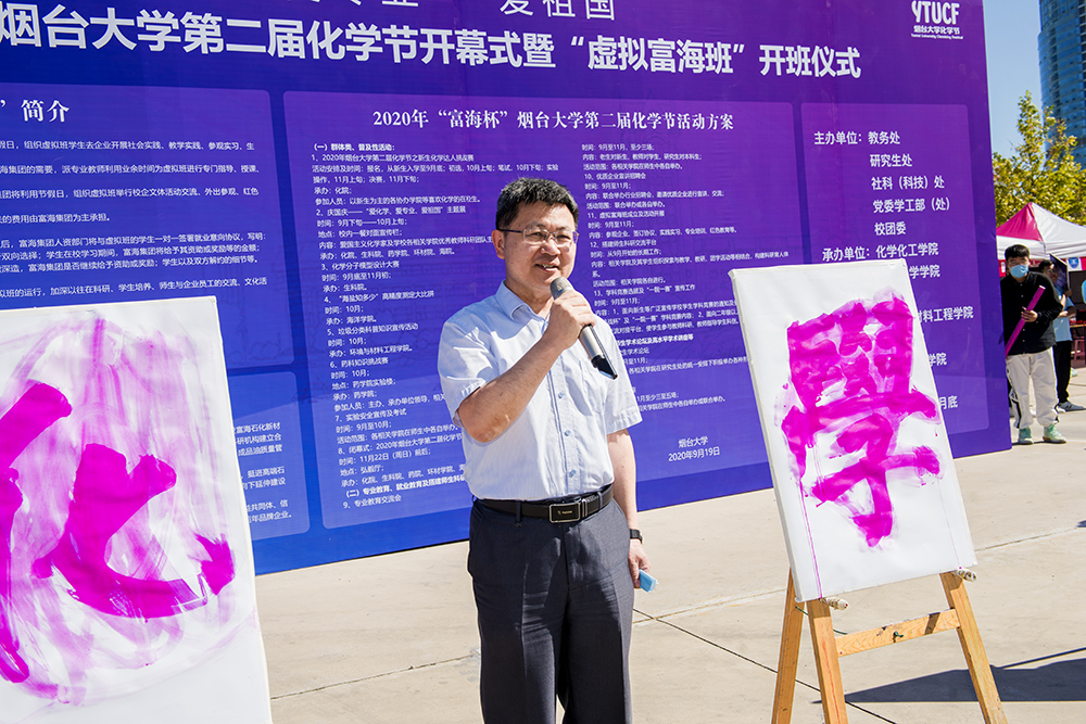 煙臺大學化學節(jié)由教務(wù)處、研究生處、社科(科技)處、黨委學工部(處)、校團委主辦,化學化工學院承辦,生命科學學院、藥學院、環(huán)境與材料科學學院、海洋學院、音樂舞蹈學院協(xié)辦,今年已是第二屆。在化學節(jié)開幕式上,校黨委書記張偉、校長郭善利、富海集團郭元山共同用化學顯色反應(yīng)的方式為本屆化學節(jié)揭幕,充分展現(xiàn)化學的神奇之處。隨后,舉行了煙臺大學化學化工學院“虛擬富海班”開辦儀式。校長郭善利老師先后為富海集團郭元山先生和富海集團朱相濱先生、化院專業(yè)教師翁永根老師和化院團委陳俊羲老師頒發(fā)“煙臺大學大學生就業(yè)導(dǎo)師”聘書及“‘虛擬富海班’導(dǎo)師”聘書。