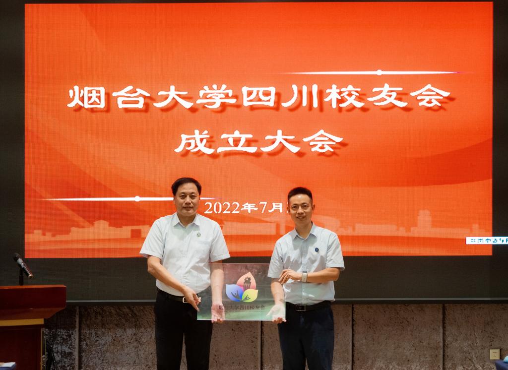 張殿臣宣布煙臺大學四川校友會正式成立,為四川校友會授牌、授旗。于秀國為四川校友會第一屆理事會會長、化學化工學院1999級校友李坤頒發會長聘書。