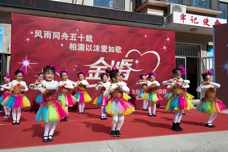 山東省老教協副會長、煙臺大學老教協會長于文書教授現場揮毫潑墨——“五十年風雨同舟恩愛可昭日月,古稀年比翼雙飛幸福猶感地天”。部分學院在職教師、學生代表以及煙大幼兒園的小朋友們也通過視頻錄制和現場表演的形式給金婚老教師們送上美好祝福。