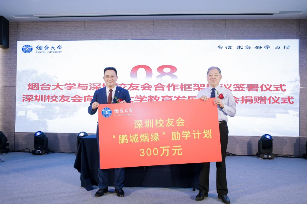 隨后,宋中民和蔣琪簽署了煙臺大學與深圳校友會合作框架協議。蔣琪代表深圳校友會向母校捐贈“鵬城煙緣”勵學計劃300萬元。